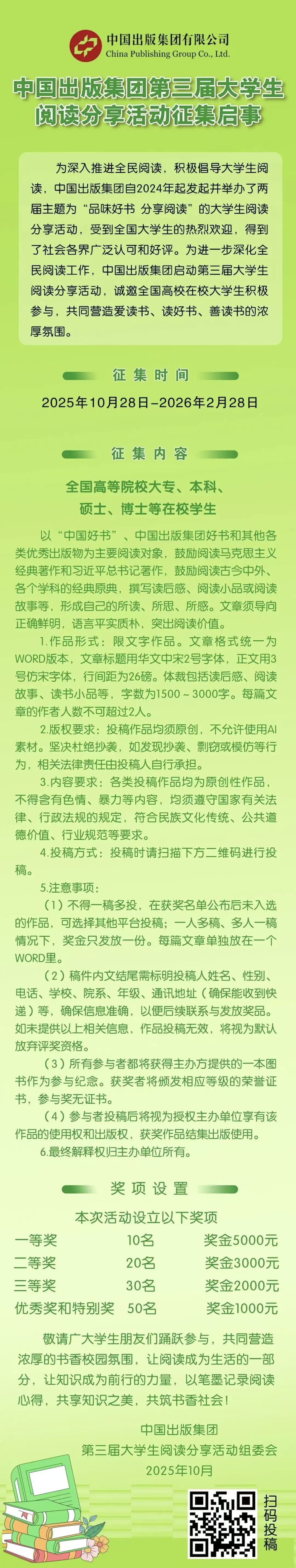 书页翻动 是思想碰撞的声音笔墨流转 是青春共鸣的印记第三届中国出版集团大学生阅读分享活动现已正式启航让我们一起以书为舟 以分享为帆驶向更广阔的思维海洋 为深入推进全民阅读,积极倡导大学生阅读,中国出版集团自2024年起发起并举办了两届主题为“品味好书 分享阅读”的大学生阅读分享活动,受到全国大学生的热烈欢迎,得到了社会各界广泛认可和好评。为进一步深化全民阅读工作,中国出版集团于2025年10月28日在中国人民大学正式启动第三届大学生阅读分享活动,诚邀全国高校在校大学生积极参与,共同营造爱读书、读好书、善读书的浓厚氛围。欢迎大家踊跃投稿! 征集时间2025年10月28日〜2026年2月28日 征集范围全国高等院校大专、本科、硕士、博士等在校学生 征集内容以“中国好书”、中国出版集团好书和其他各类优秀出版物为主要阅读对象, 鼓励阅读马克思主义经典著作和习近平总书记著作,鼓励阅读古今中外、各个学科的 经典原典,撰写读后感、阅读小品或阅读故事等,形成自己的所读、所思、所感。文 章须导向正确鲜明,语言平实质朴,突出阅读价值。(一)作品形式限文字作品。文章 格式统一为WORD版本,文章标题用华文中宋2号字体,正文用3号仿宋字体,行间距 为26磅。体裁包括读后感、阅读故事、读书小品等,字数为1500~3000字。每篇文章 的作者人数不可超过2人。(二)版权要求投稿作品均须原创,不允许使用AI素材。坚 决杜绝抄袭,如发现抄袭、剽窃或模仿等行为,相关法律责任由投稿人自行承担。(三 )内容要求各类投稿作品均为原创性作品,不得含有色情、暴力等内容,均须遵守国 家有关法律、行政法规的规定,符合民族文化传统、公共道德价值、行业规范等要求。 (四)投稿方式投稿时请扫描下方二维码进行投稿。(五)注意事项1. 不得一稿多投, 在获奖名单公布后未入选的作品,可选择其他平台投稿;一人多稿、多人一稿情况下, 奖金只发放一份。每篇文章单独放在一个WORD里。2. 稿件内文结尾需标明投稿人姓 名、性别、电话、学校、院系、年级、通讯地址(确保能收到快递)等,确保信息准 确,以便后续联系与发放奖品。如未提供以上相关信息,作品投稿无效,将视为默认放 弃评奖资格。3. 所有参与者都将获得主办方提供的一本图书作为参与纪念。获奖者将 颁发相应等级的荣誉证书,参与奖无证书。4. 参与者投稿后将视为授权主办单位享有该 作品的使用权和出版权,获奖作品结集出版使用。(六)最终解释权归主办单位所有。 奖项设置本次活动设立以下奖项:一等奖:10名,奖金5000元二等奖:20名,奖金30 00元三等奖:30名,奖金2000元优秀奖和特别奖:50名,奖金1000元 敬请广大学生朋友们踊跃参与,共同营造浓厚的书香校园氛围,让阅读成为生活的一 部分,让知识成为前行的力量,以笔墨记录阅读心得,共享知识之美,共筑书香社会! 每一次阅读是与未知的对话每一次分享是让思想发光的机会第三届大学生阅读分享活动正等待每一个独特的你前来书写精彩同学们 快来加入我们让好书被看见 让思考被听见共同在校园里掀起一场温暖而深刻的思想浪潮吧