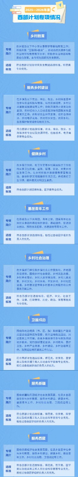 025年大学生志愿服务西部计划 正在火热招募中 欢迎广大有理想、敢担当 能吃苦、肯奋斗的 新时代好青年 踊跃报名 一起扎根基层,建功西部,报效祖国 3月1日至5月10日,2025年普通高等学校应届毕业生或在读研究生,可通过微信公众号“西部志愿汇”(菜单栏中的“我要报名”)或登录西部计划官方网站(http://xibu.youth.cn),在西部计划报名系统中注册报名。 什么是西部计划? 参加西部计划主要做些什么? ...... 2025-2026年度 大学生志愿服务西部计划实施方案 一图读懂来啦! ⬇⬇⬇