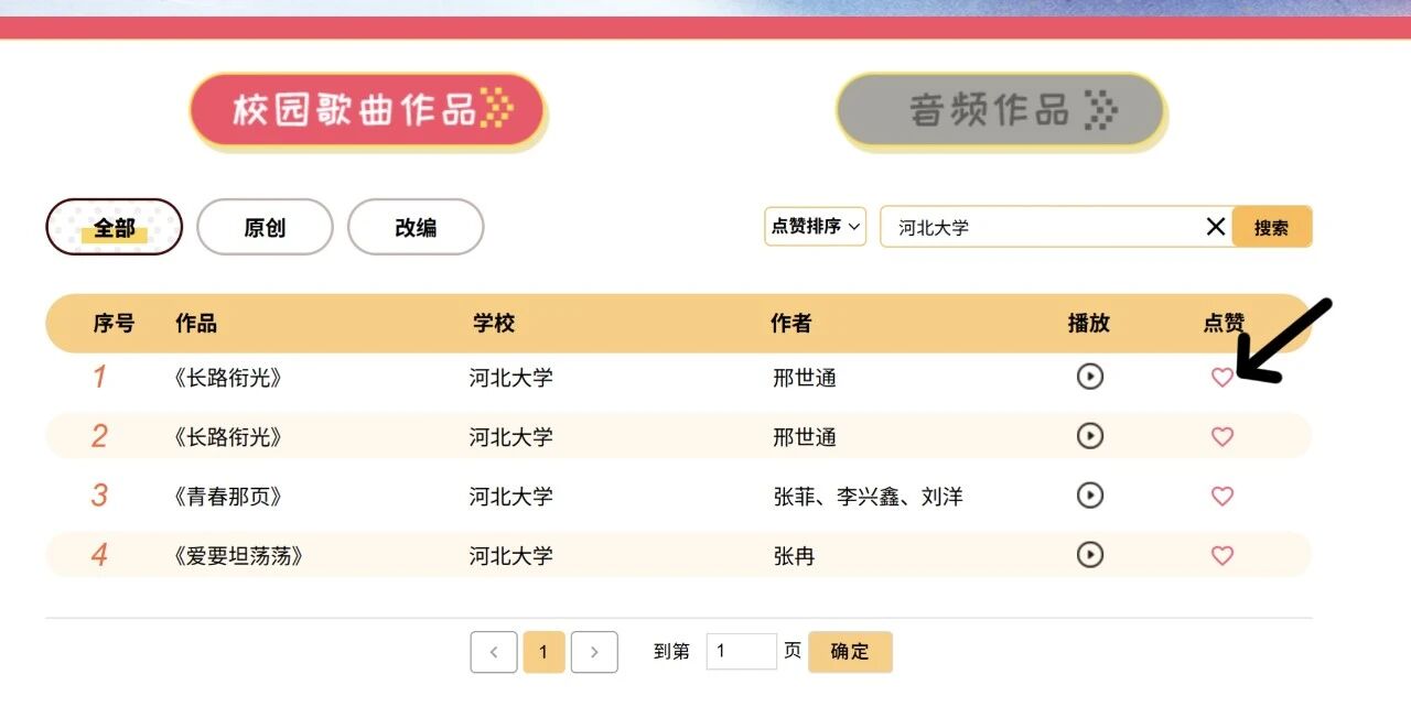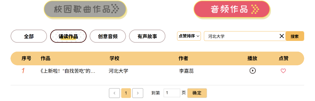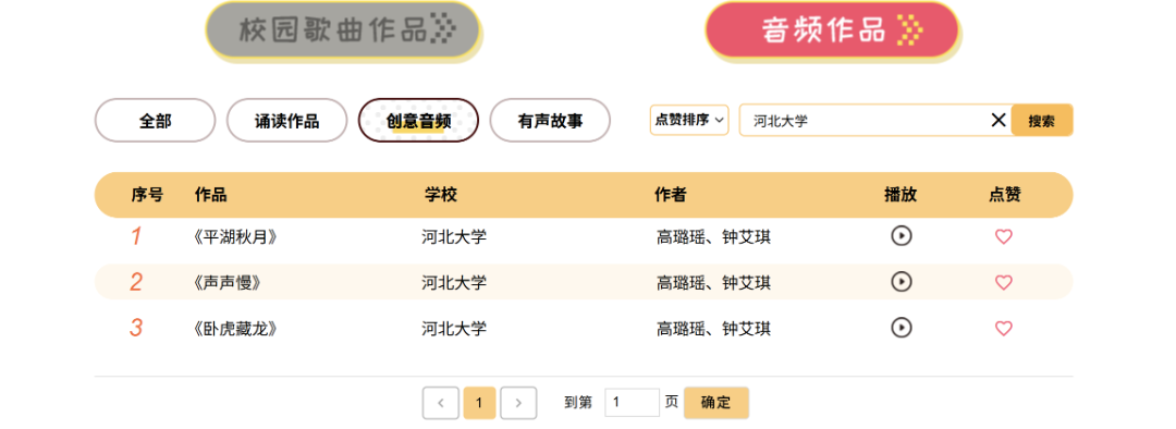 校园歌曲作品和音频作品每人每天投票上限各为五票,每个作品每天只能投一票。 03 河大作品