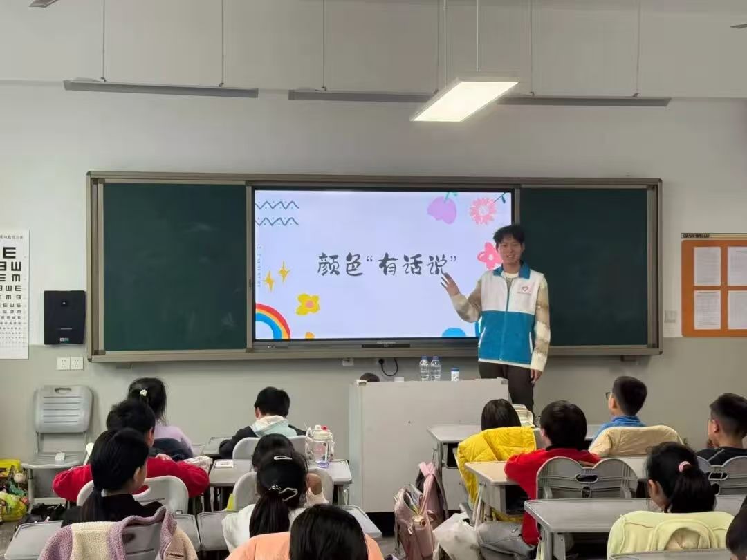 10月23日,化学与材料科学学院志愿者走进前卫路小学深保校区开展“颜色‘有话说’”化学小课堂,通过讲解与实验带孩子们感受化学魅力。