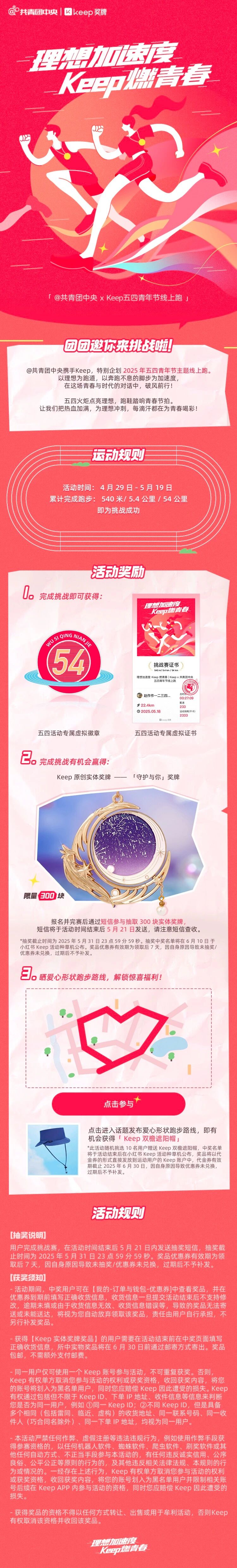 五四火炬点亮理想跑鞋踏响青春节拍@共青团中央 携手@Keep 特别企划2025年“五四青年节”主题线上跑 以理想为跑道以奔跑不息的脚步为加速度在这场青春与时代的对话中破风前行! 戳图⬇⬇查看活动详情叫上身边的家人、朋友 一起跑起来!!!