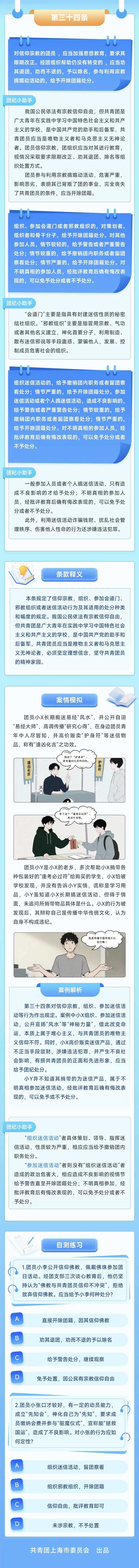 为帮助广大团员深入理解新修订的《中国共产主义青年团纪律处分条例(试行)》(以下简称《条例》),做到学纪、知纪、明纪、守纪,团上海市委组织编写了《团纪微课堂》学习手册,详细介绍《条例》第四章“对违反纪律行为的处分”,帮助团员更好理解各类违反纪律的具体行为及其适用的处分种类和幅度。手册以长图连载形式推送,第二期推出《条例》第三十三、三十四条学习内容。